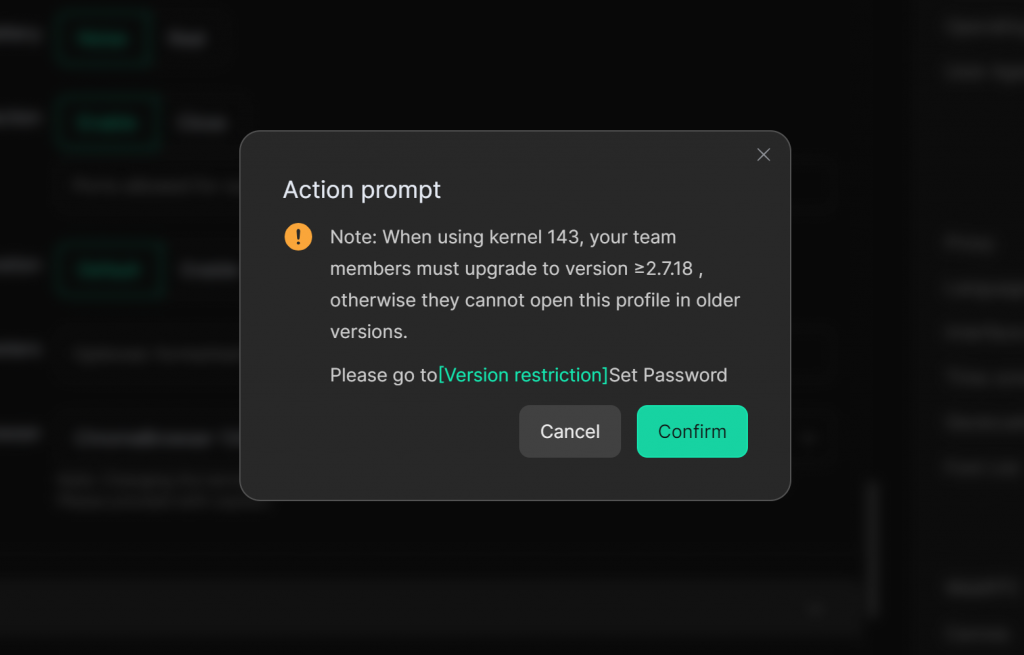 Please note: When using kernels 142 and 143, your team members must upgrade to a newer version (≥2.7.18), otherwise they cannot open this profile in older versions. You can restrict the versions members use via the Version restriction.