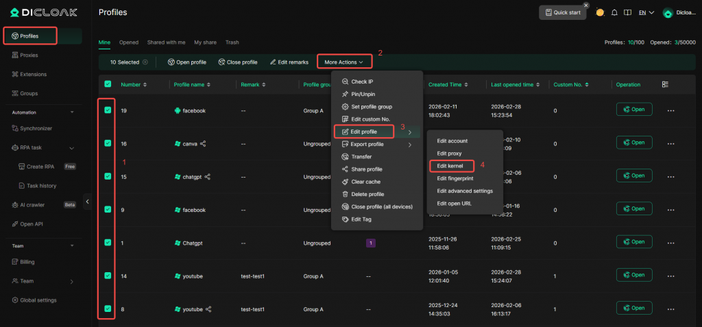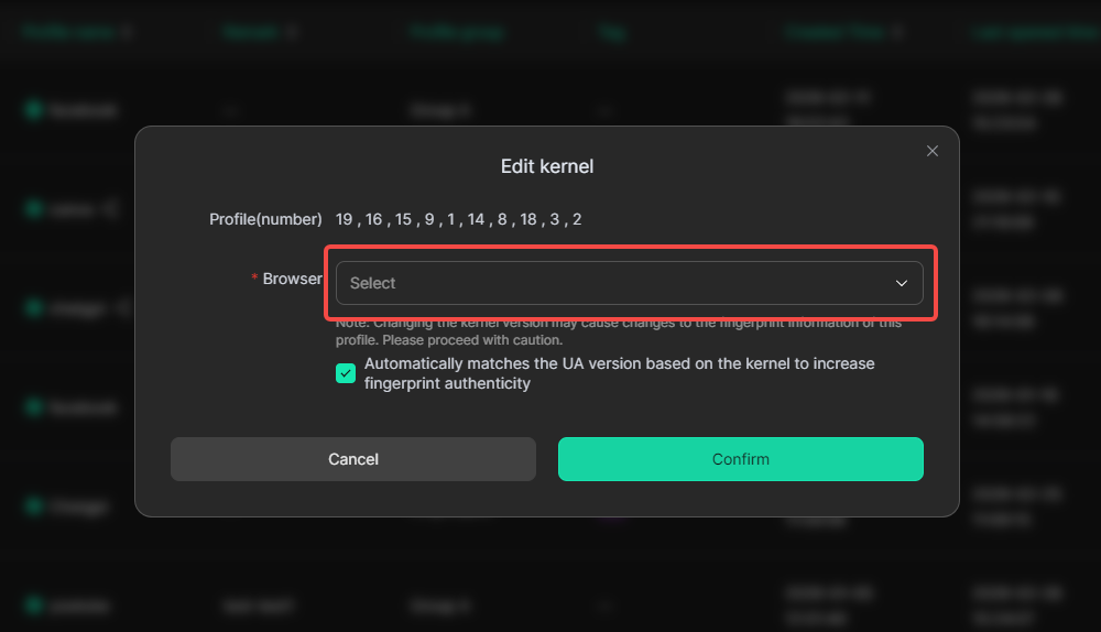 Profile Kernel refers to the Chrome browser version used by the specific browser profile. If you wish to change the kernel of a profile, please follow these steps: