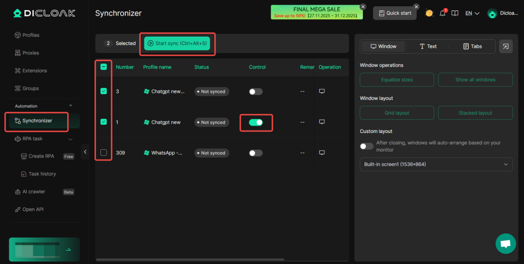 For the plus plan, DICloak offers a window synchronization feature. Once activated, the selected windows will perform the same actions as the master control window. By using window synchronization to execute operations such as mouse clicks, keyboard inputs, and page scrolling, you can complete repetitive tasks all at once, saving time, reducing operational complexity, and ensuring consistency and accuracy.