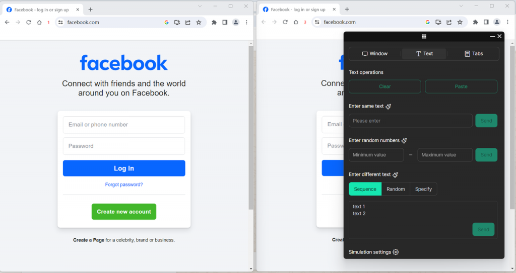 - Text: Set text operations and input content. Supports entering different texts or random numbers for different windows. Delayed input and clicking can also be configured.