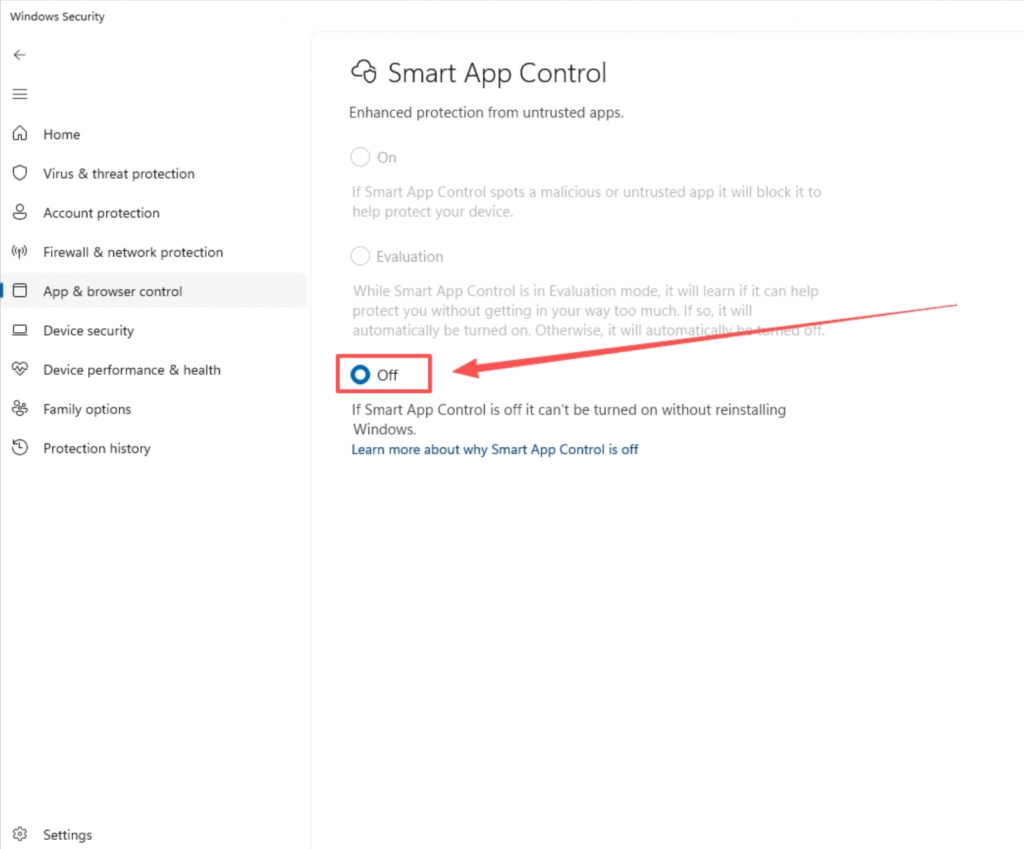 - Temporarily turn off: Smart App Control, Reputation-based protection settings → Block untrusted apps