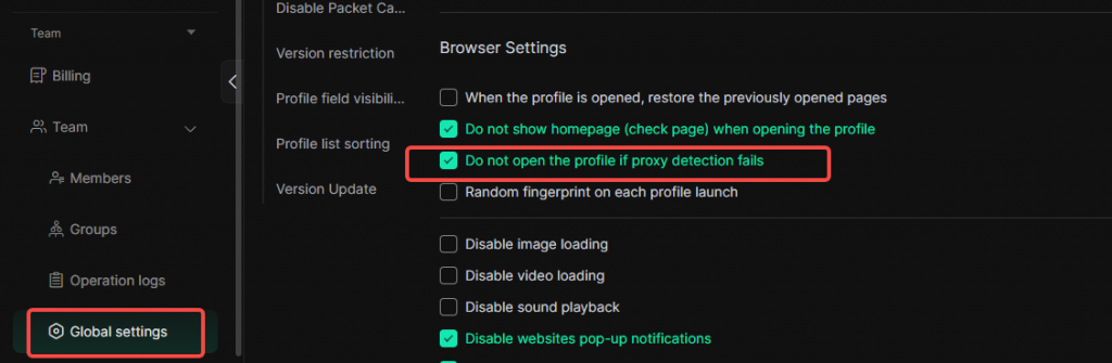To maintain account stability and avoid risks posed by proxy IP address changes, please go to [Global Settings] and uncheck [Do not open the profile if proxy detection fails].