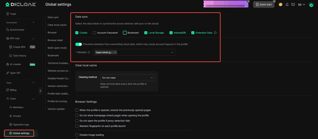 - Enable Data Sync Feature: Go to [Global Settings] and enable the data sync feature.