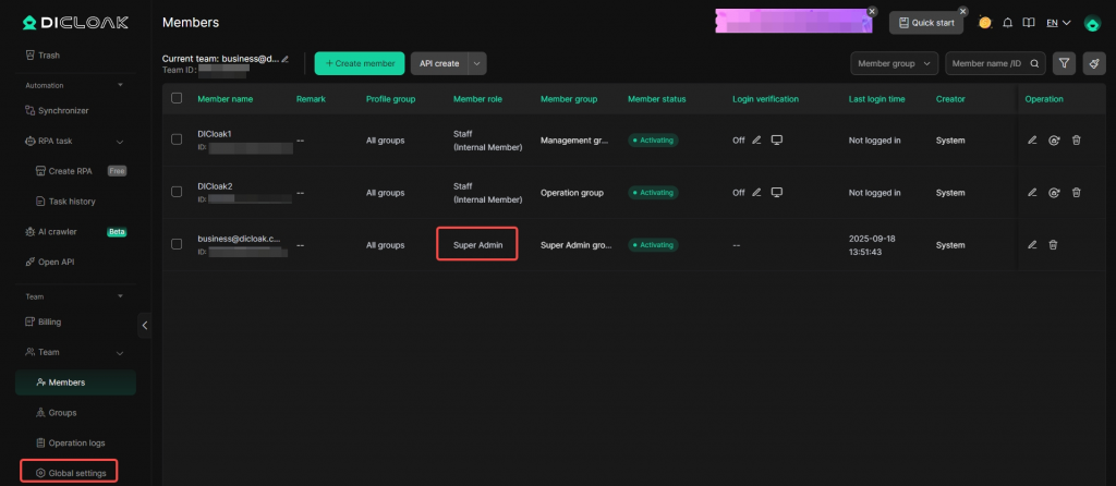 Important Note: The following operations should be performed using the super admin account (you can check the admin account in the member list).