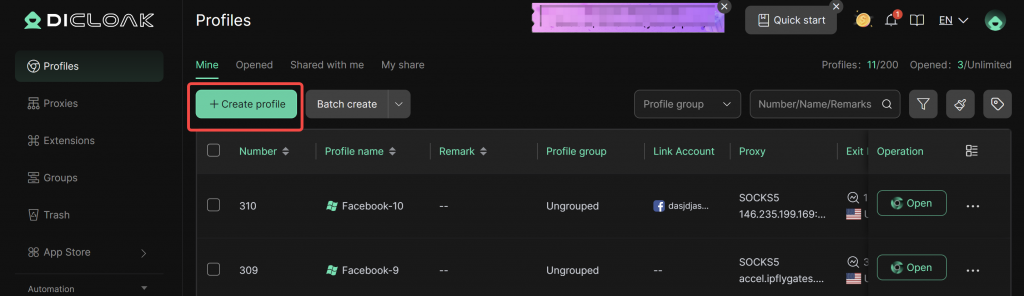 DICloak antidetect browser allows you to create independent browser profiles and IP addresses for each Facebook account. This way, you can easily manage multiple Facebook accounts. At the same time, DICloak’s anti-linking feature significantly reduces the risk of your Facebook accounts being banned.