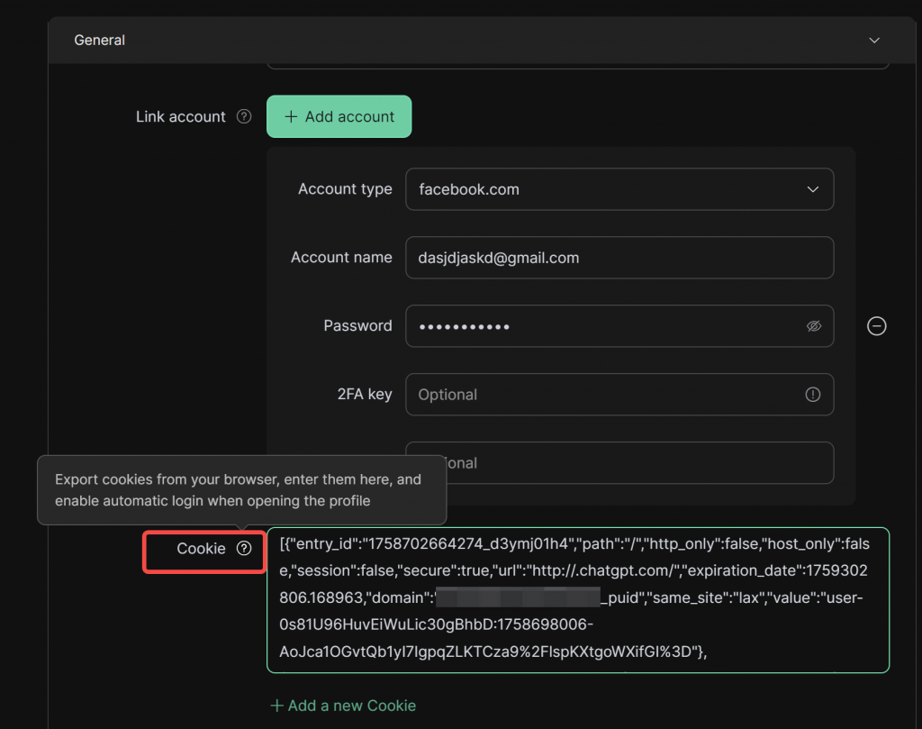 - Import Cookie Data: Import the cookies of the logged-in Facebook account to maintain the login state of the Facebook account.