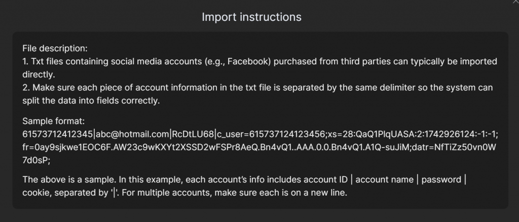 If you have purchased a large number of Facebook accounts from a Facebook account provider and need to import them into DICloak, follow the steps below:
