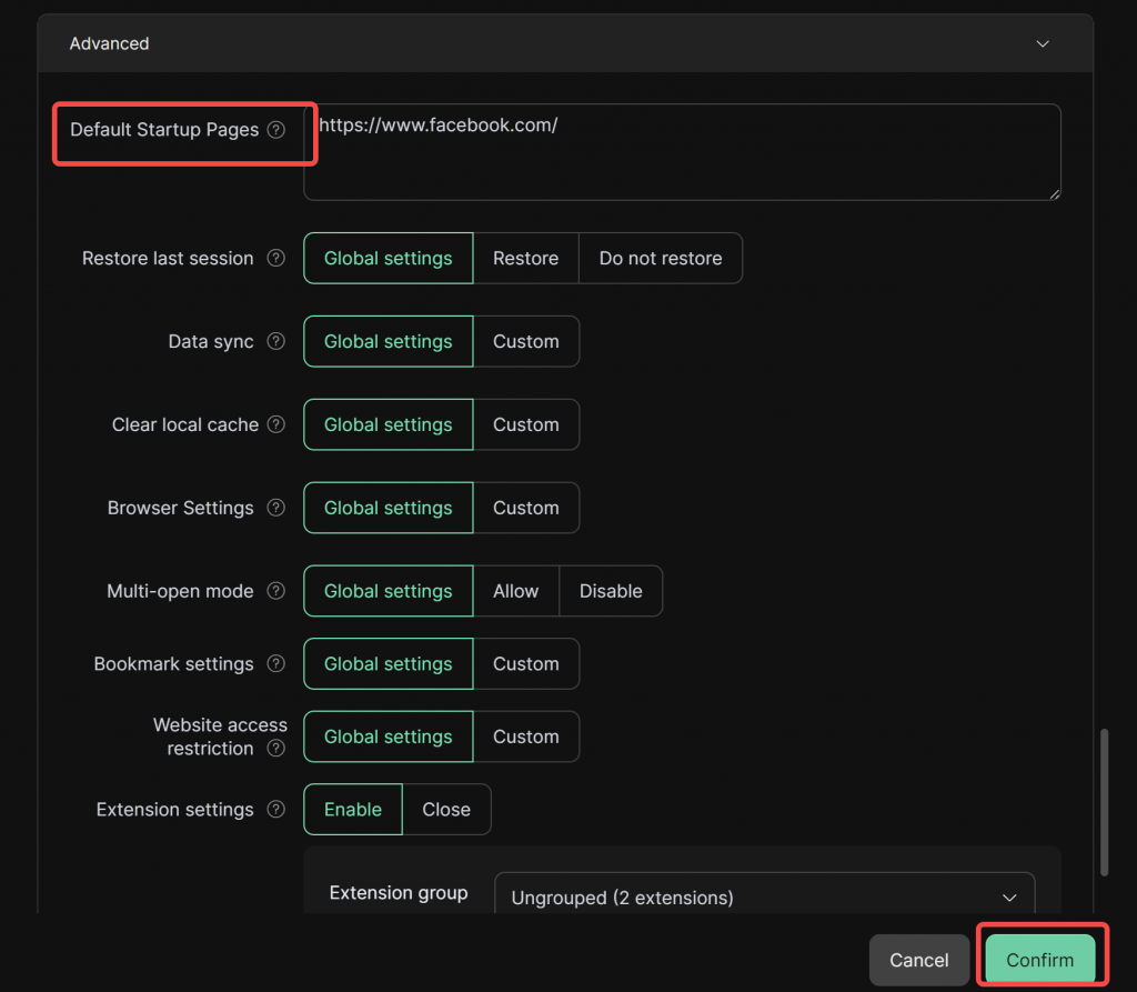 - Set Default Startup Page: Enter the Facebook URL into the [Default Startup Pages] field so that every time you open the profile, it will directly open Facebook. Then, save the settings.