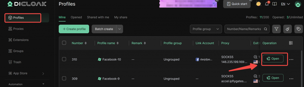- Open the Profile to Access Facebook: Go to the [Profile Management] list and click [Open] to access the Facebook account.