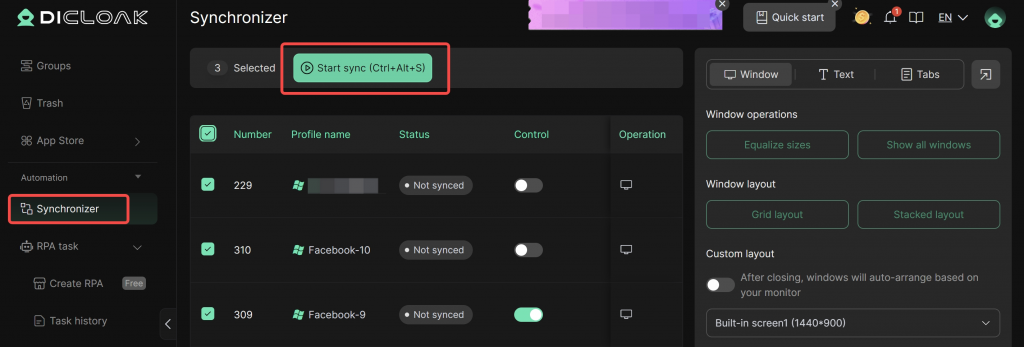 You can use the window synchronization feature to operate multiple Facebook browser profiles at the same time, avoiding repetitive tasks.