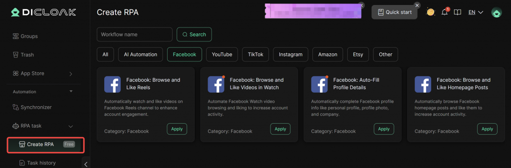 You can use the RPA template to automate Facebook account nurturing, reducing labor and time investment while improving the efficiency of account nurturing (You can contact DICloak customer service to customize related RPA workflows).