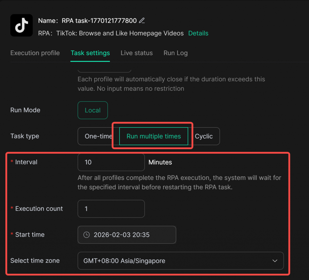 2. Run multiple times: By flexibly setting the task interval, execution count, start time, and effective region, you can easily configure the task’s loop execution strategy to achieve stable and controllable repeated automated operation.