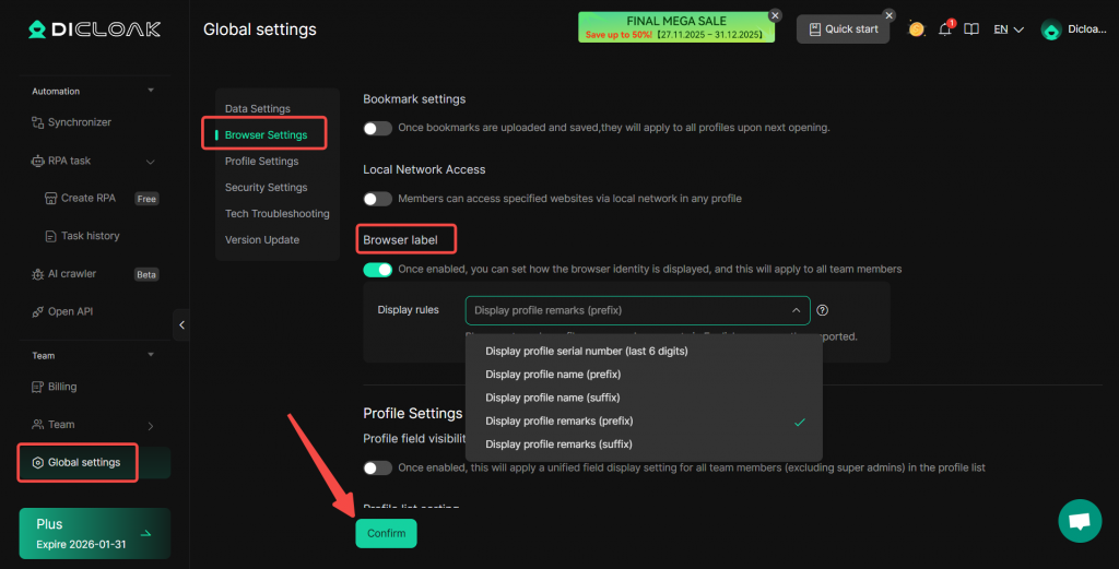 Navigate to Global Settings in the left navigation bar, find Browser label in Browser Settings, enable it, and configure the display rules. Click “Confirm” after completing the settings.