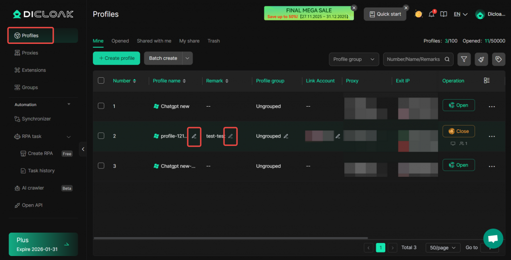 Note: You can edit the Profile name and Remark in the profiles to display the browser label you want to see.
