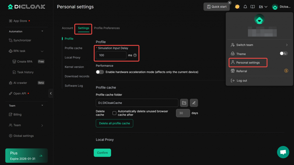 - Open and log in to the DICloak software. Click the avatar in the upper-right corner to enter [Personal Settings]. Click [Settings] to view the [Simulated Input Delay] feature.