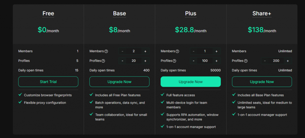 You can choose the plan that suits your business model and scale. If you need to create many browser profiles but don’t need to open them frequently, then the Team plan is ideal for your needs. If you require fewer browser profiles but with frequent access, then Pro plan would be a better fit.