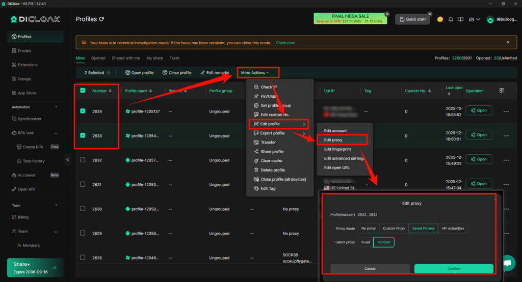 A new “Random” option has been added to the “Proxy Settings” of <profile – Batch Create/Edit profiles>, and the system will prioritize assigning unused proxies to each profile (only if all proxies have been used will it randomly assign used proxies)