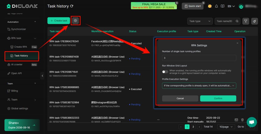 A new option “Close Opened profile” has been added to [RPA – Task history], which enables the currently opened profile to also run RPA tasks normally, reducing the phenomenon of RPA running failures caused by manually opening the usage profile.