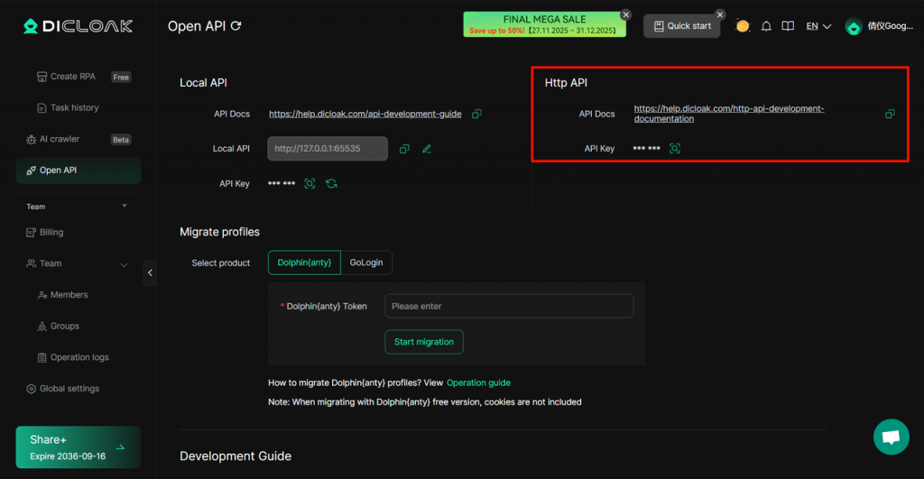 [Open API] New HTTP API interfaces have been added, supporting calls to DICloak’s profile-related interfaces, including operations such as getting the profile list, adding a new profile, editing an existing profile, deleting an profile, and completely removing an profile. For specific parameters, please refer to the API Development Document.