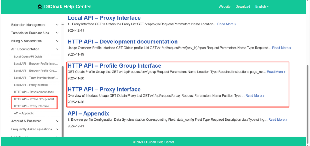 New profile group interface and proxy interface are added, supporting flexible configuration of request parameters via HTTP protocol to implement operations on profile groups and proxies in DICloak software.