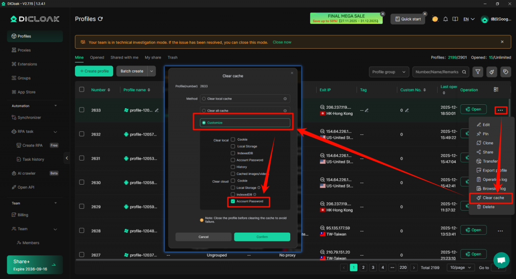 [profile – Clear Cache] A new local [Account Password] cache clearing option has been added. You can choose to clear the account password data saved in the browser. Before the operation, you need to close the profile to avoid failure.