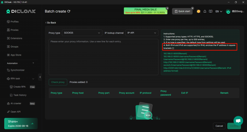 Optimized the [Proxies – Batch create / import] function, and added support for IPv6 agent format. Filling in IPv6 addresses according to the specification (when filling in the host of IPv6, it needs to be enclosed in [] ) can improve the efficiency of batch creating agents.