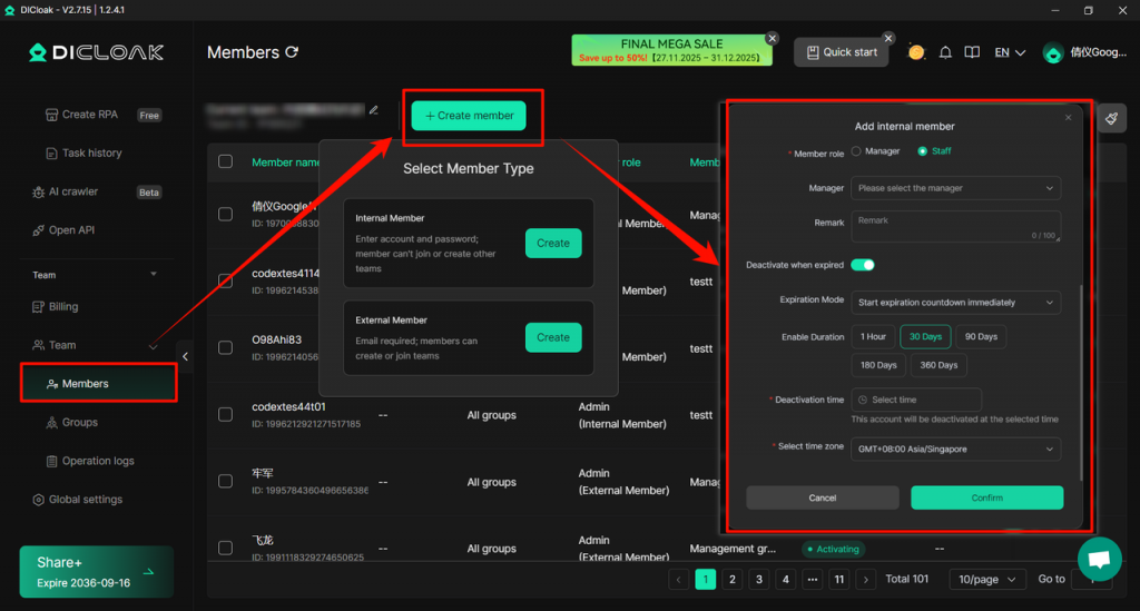 The <Member> option in <Member List> has added a new member account deactivation feature based on “first login time”. Administrators can set the expiration method to “start countdown after first login” when adding members and customize the number of expiration days (example: 30 days). After expiration, the member account will be automatically deactivated.