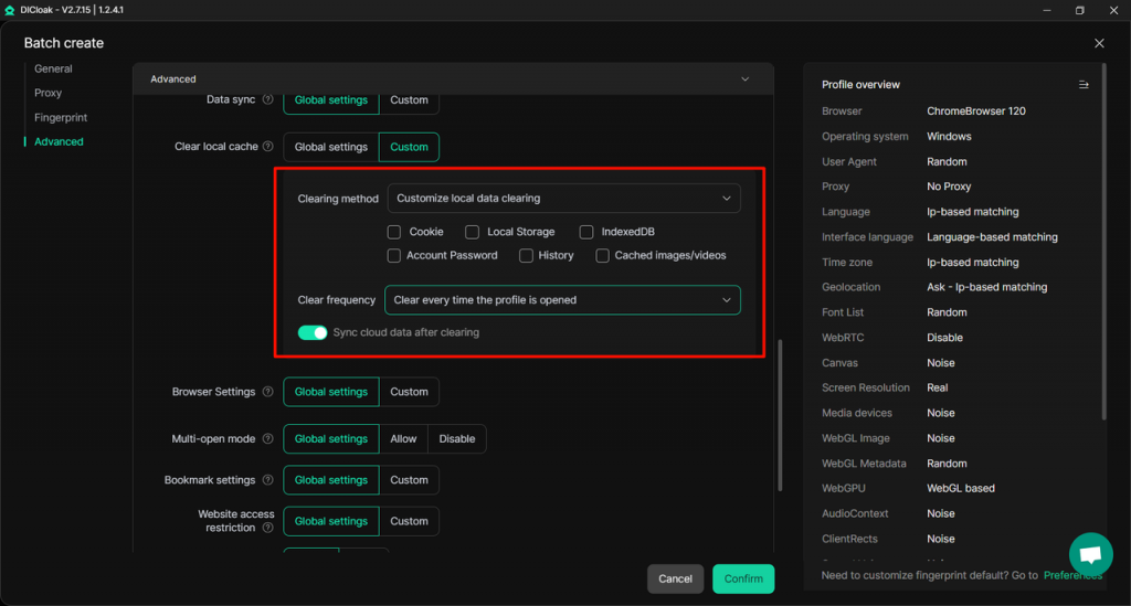 [profile – Create/Edit profile], the “Clearing method” configuration, is a newly added feature. You can customize the cache cleaning frequency and enable [Customize local data clearing] to maintain consistency between local and cloud data.
