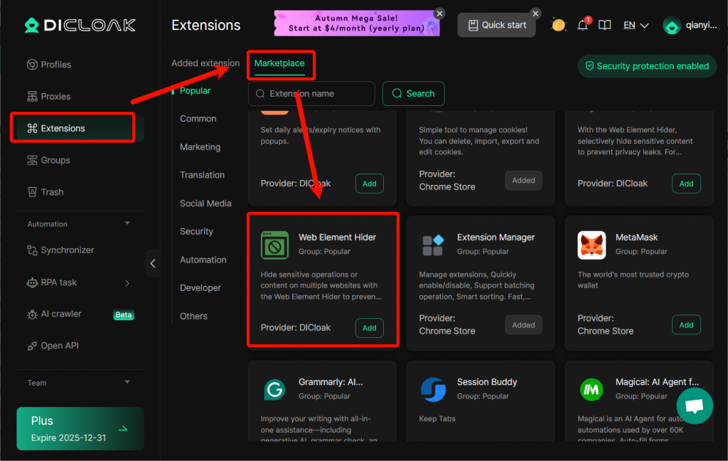 Click on [Extensions], enter [Marketplace], find the [Web Element Hider] extension, and click [Add] to edit the extension parameters.