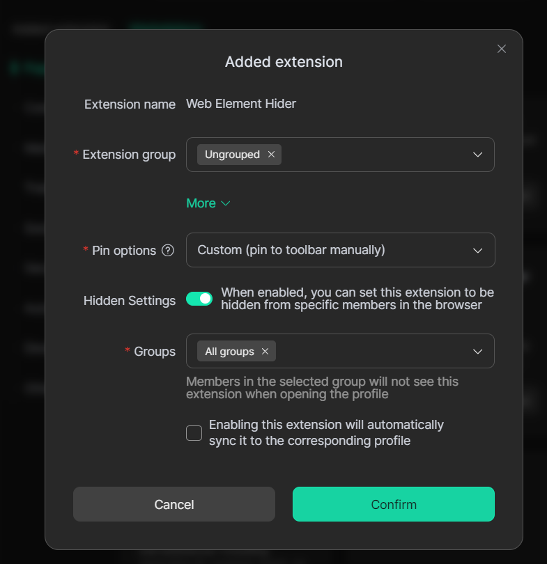 - Hidden Settings: Once enabled, you can set the current extension to not be displayed to specified members in the browser.