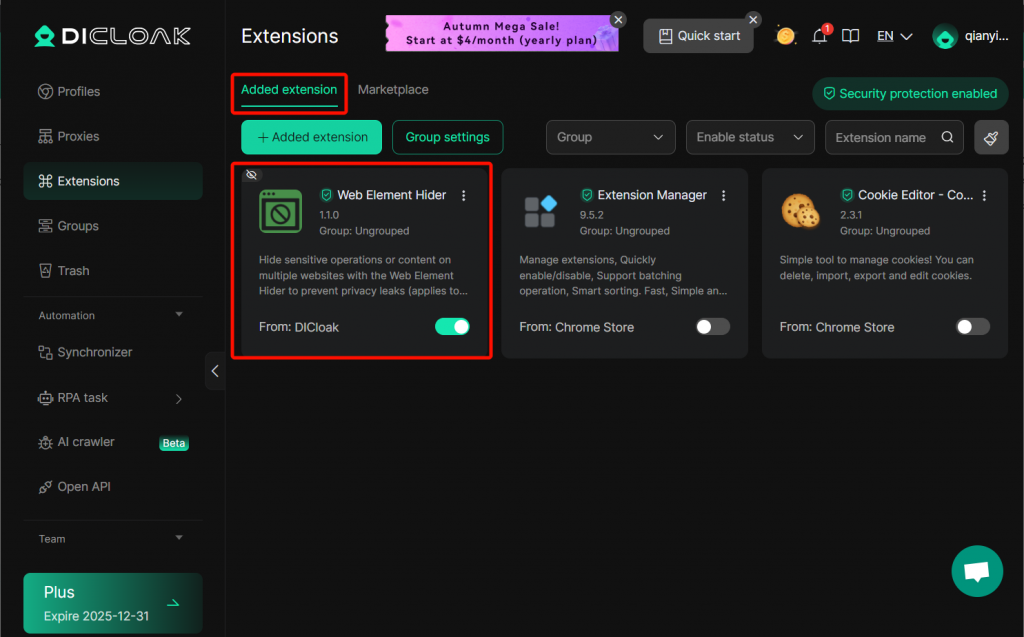 The [Web Element Hider] extension supports hiding web element entries on multiple websites to prevent account privacy leakage (it will take effect on all environments where this extension is bound). You can use this plugin to hide sensitive web information/entries, and it will take effect for all team members (note: please also enable “Hide Settings” in the extension editor to hide this extension from members and prevent them from modifying it).