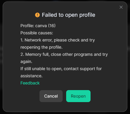 If you see the above prompt when opening a profile, please first ensure that you are opening it within the APP, as browser profiles cannot currently be opened via a web browser. If you are opening it within the APP, the issue is usually caused by network problems or insufficient disk space. You can try the following methods to resolve this issue: