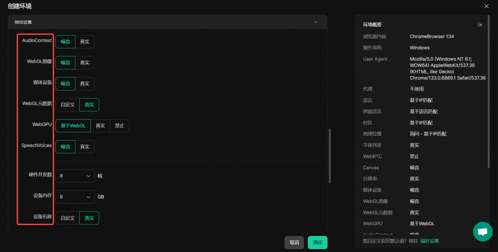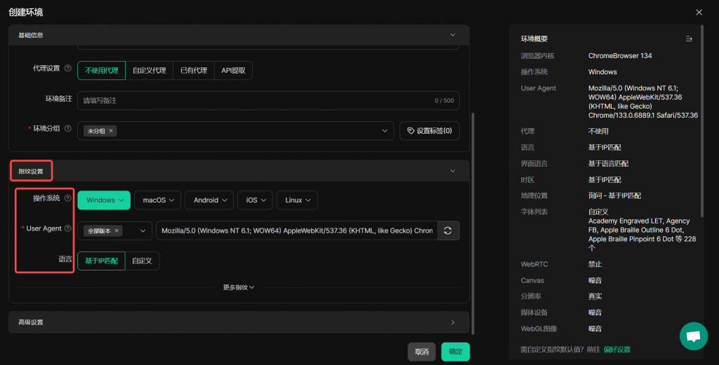 “编辑环境” 界面中的 “指纹设置” 部分,用于配置模拟浏览器的各项特征信息,这些指纹设置可全方位模拟真实设备与浏览器环境。