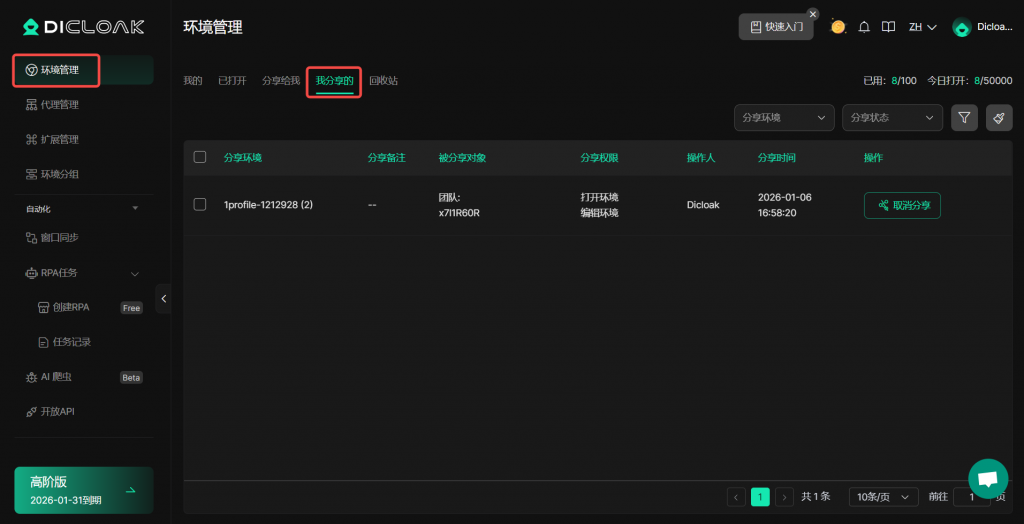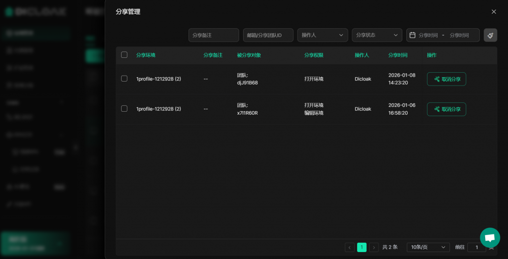 在【环境管理】中,已分享的环境旁边会显示“分享”图标,点击该图标可查看该环境的分享记录并操作“取消分享”
