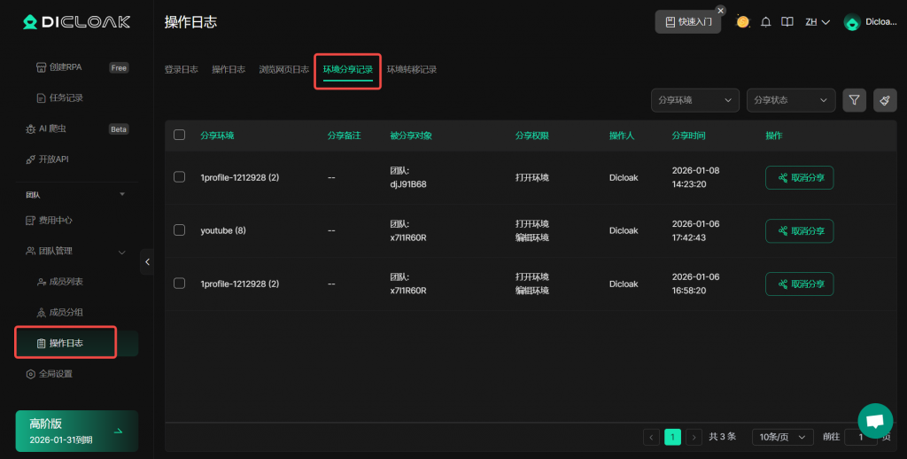 在左边导航栏找到【团队管理】后点击【操作日志】-【环境分享记录】可以查看已分享环境的详情,在此同样可以“取消分享”
