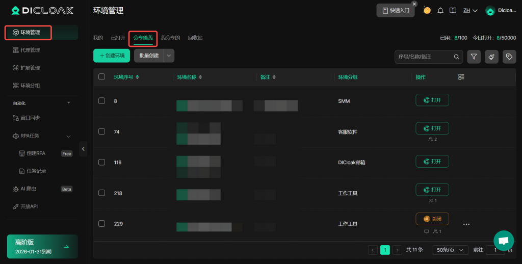 打开并登录DICloak软件,在左边导航栏找到【环境管理】,进入环境列表页面。