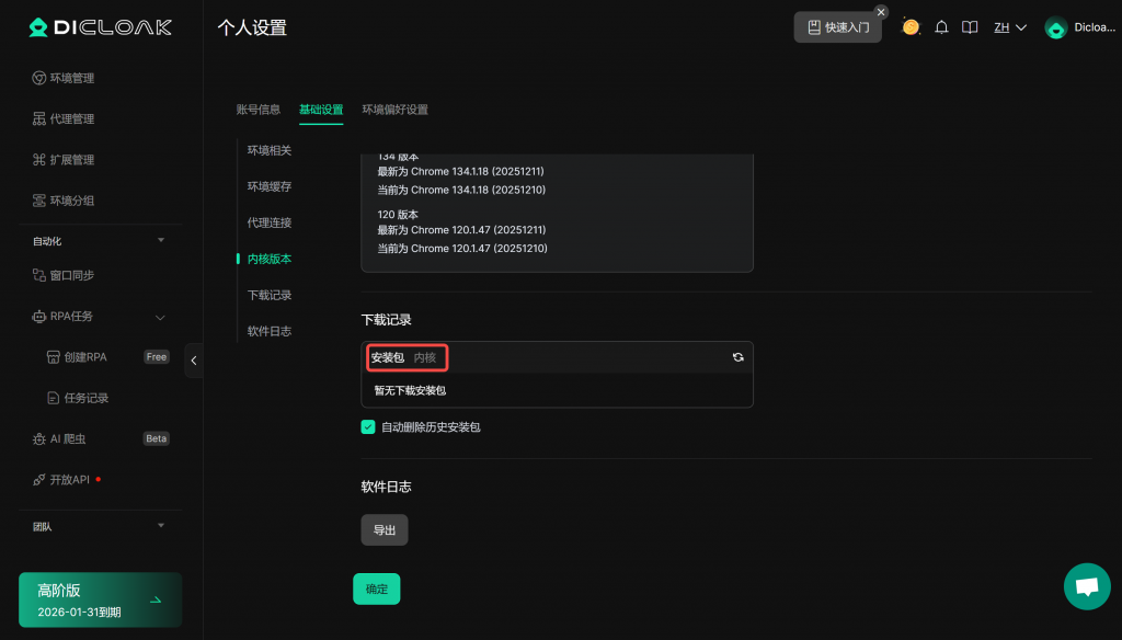 Home » 个人设置-下载记录个人设置-下载记录by DICloak2024 年 11 月 4 日2026 年 1 月 14 日 下载记录功能允许您查看在DICloak软件内下载的软件安装包和内核文件,允许重新安装已下载的历史版本并提供删除选项,您还可以设置自动删除历史安装包,来减少电脑内存压力。 1.打开个人设置 打开并登录DICloak软件,点击右上角头像,进入【个人设置】,点击【基础设置】-【下载记录】 2.下载记录 可以查看和删除已下载的软件安装包和内核,同时也可以设置“自动删除历史安装包”。