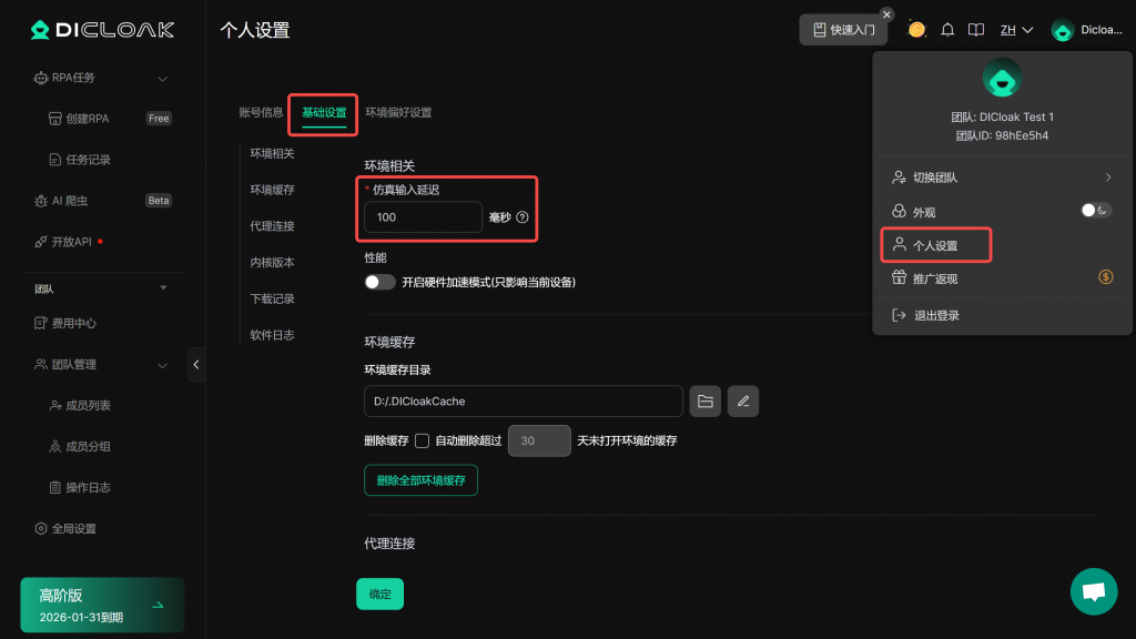 • 打开并登录DICloak软件,点击右上角头像,进入【个人设置】,点击【基础设置】可看到【仿真输入延迟】功能