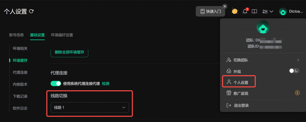 3.切换网络后,刷新环境列表页面,查看是否显示环境数据。如果仍显示加载失败,进入个人设置-基础设置,切换为其他线路,再刷新环境列表页面。