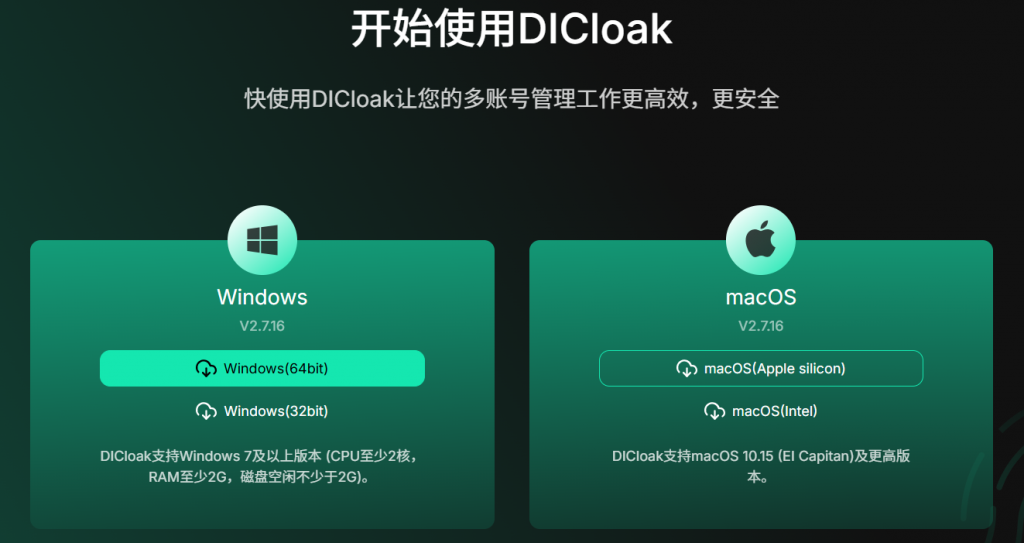 1.3 DICloak目前支持macOS 11 (macOS Big Sur 或更高版本)及更高版本和Windows 10及更高版本。如果您的系统版本低于这些版本,请考虑升级或更换设备以解决此问题。