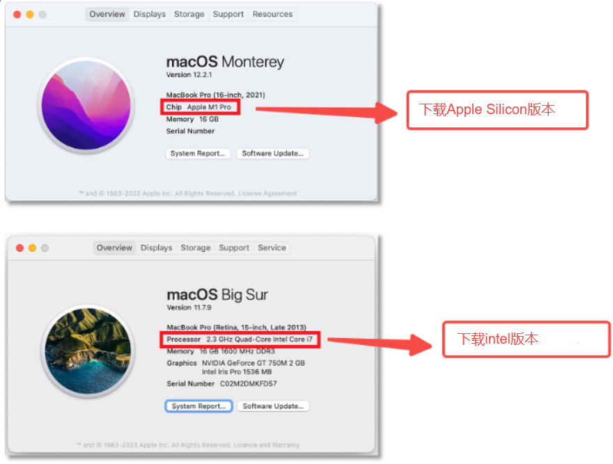 - 安装前,请检查设备的芯片类型:👉前往“关于本机”查看使用的是英特尔处理器还是苹果芯片(M1/M2 芯片)。