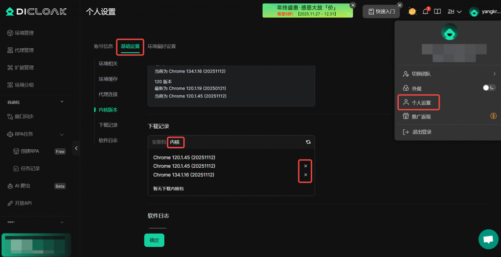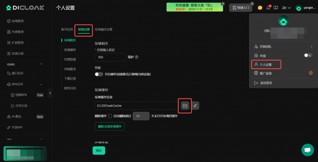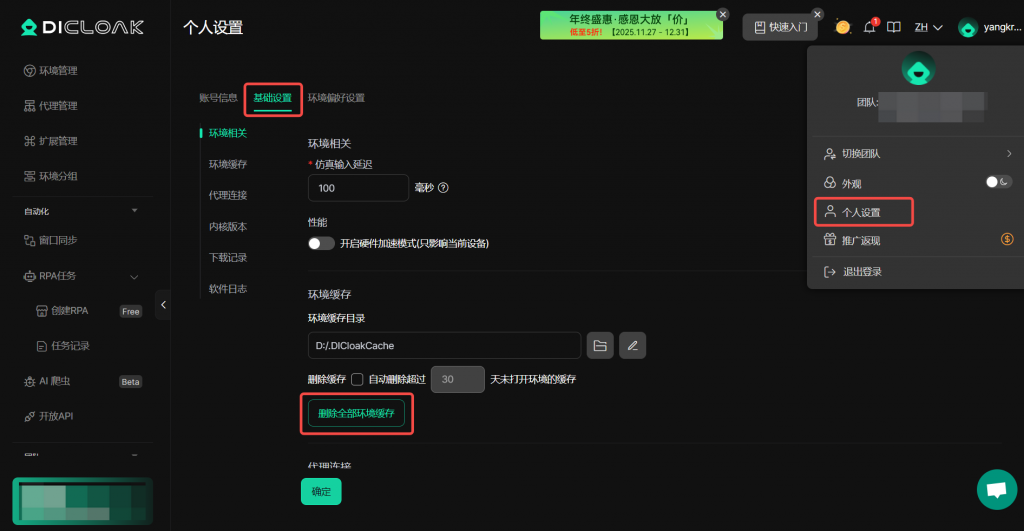 点击头像(右上角)→个人设置→基础设置→点击“删除所有个人资料缓存”→重新打开环境