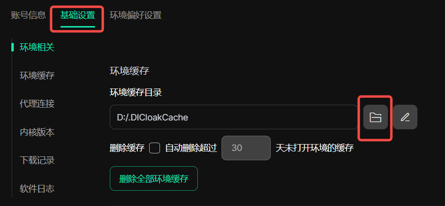 请下载正确的版本,然后点击DICloak右上角的头像,进入 个人设置>基础设置,找到下载记录并点击 “内核”,删除之前下载的所有内核文件,然后重新打开环境。