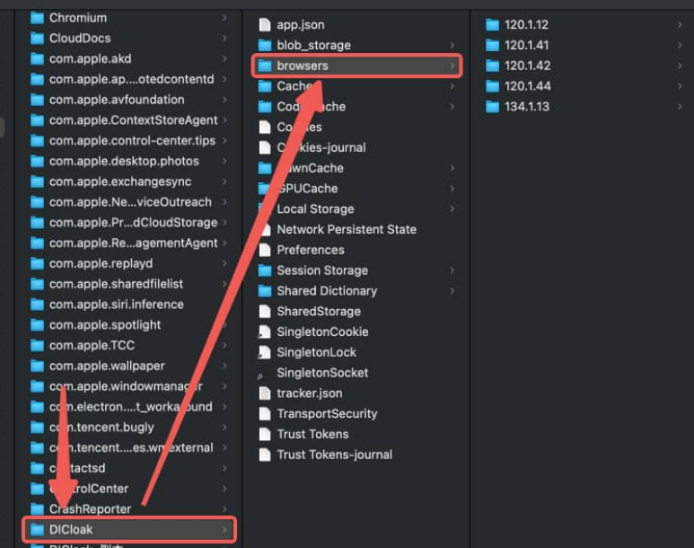 2.2 找到缓存文件夹,删除名为“browsers”的文件。(如果您是MacBook用户,请先删除名为“DICloakCache”的文件夹,之后再进入名为“DICloak”的文件夹,并删除其中的“browsers”子文件夹)