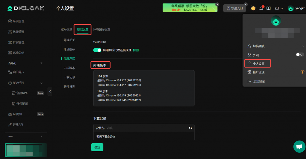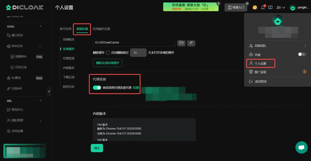 - 检查设备是否正在使用vpn,如有则需在右上角头像-个人设置-基础设置,开启代理连接,再尝试打开环境。如仍然显示代理检测失败,可尝试切换vpn的网络节点并再次尝试;