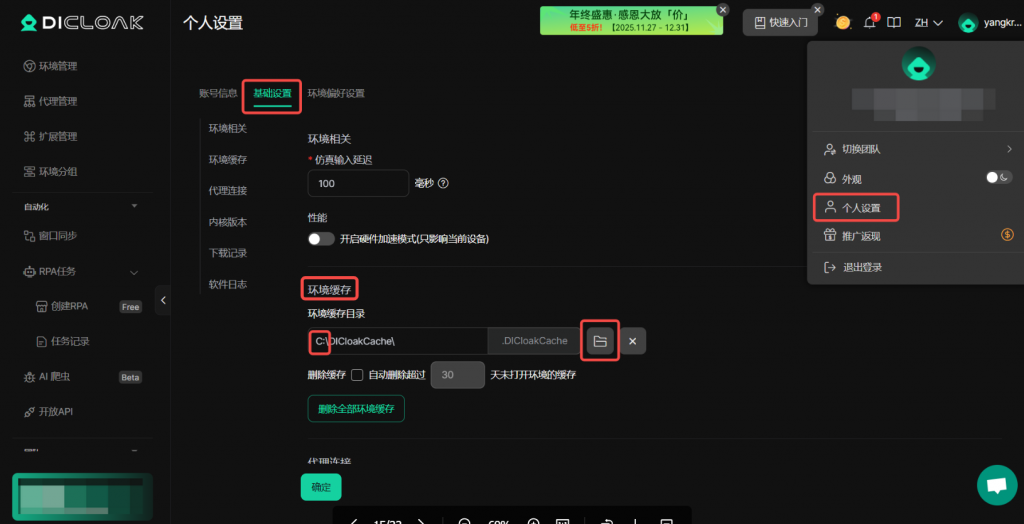 - 提示:您可以通过点击您的头像(右上角)→个人设置→设置,在 DICloak 中找到缓存文件夹路径。