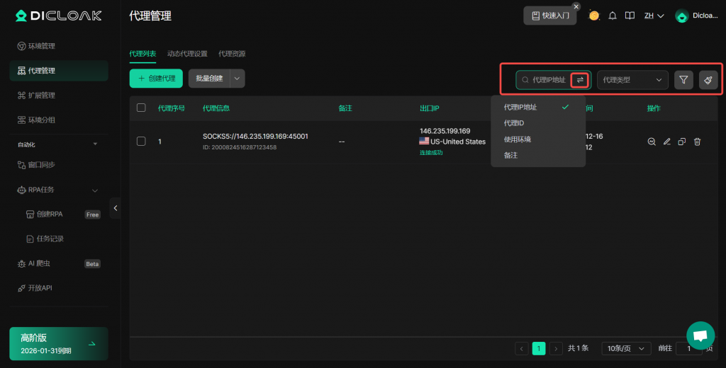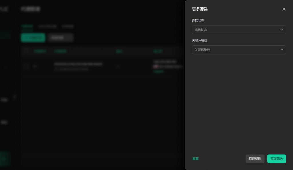 - 【代理过滤器】:您可以根据【代理IP地址】、【代理ID】、【使用环境】、【备注】、【代理类型】、【连接状态】和【关联环境数】去筛选已创建的代理,想要清空筛选条件可点击【重置】按钮。