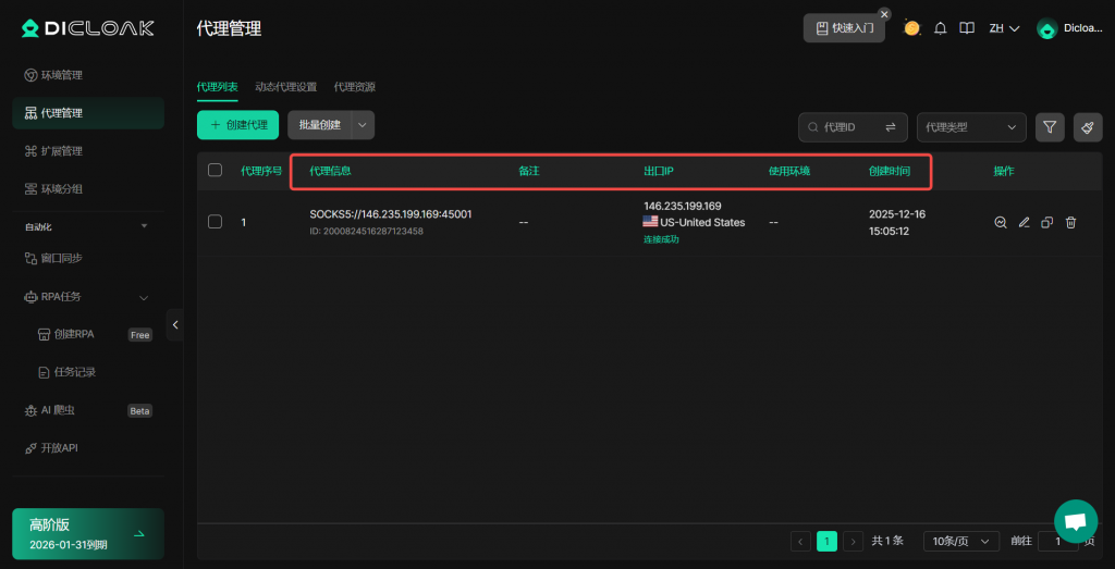 - 【代理信息】:您可了解代理ID、代理类型、代理IP等信息。