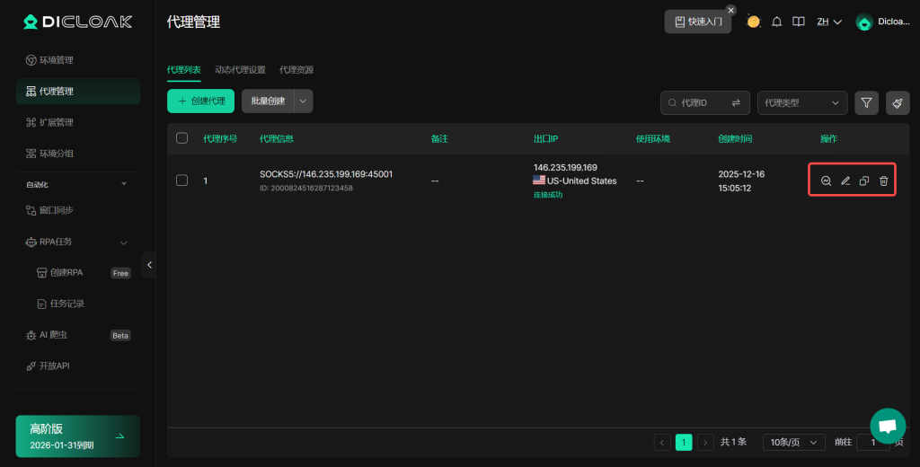 - 【操作】:您可以检测、编辑、复制代理信息或删除代理。