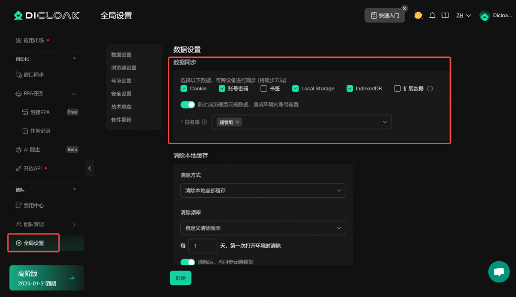 • 开启数据同步功能:前往【全局设置】,开启数据同步功能